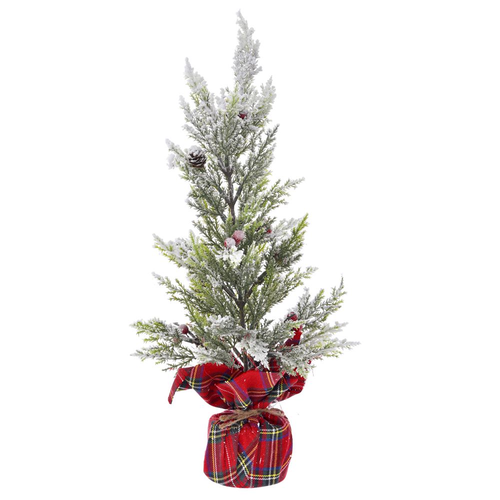 Χριστουγεννιάτικο χιονισμένο δενδράκι, διαθέτει κόκκινο καρό ύφασμα στην βάση.