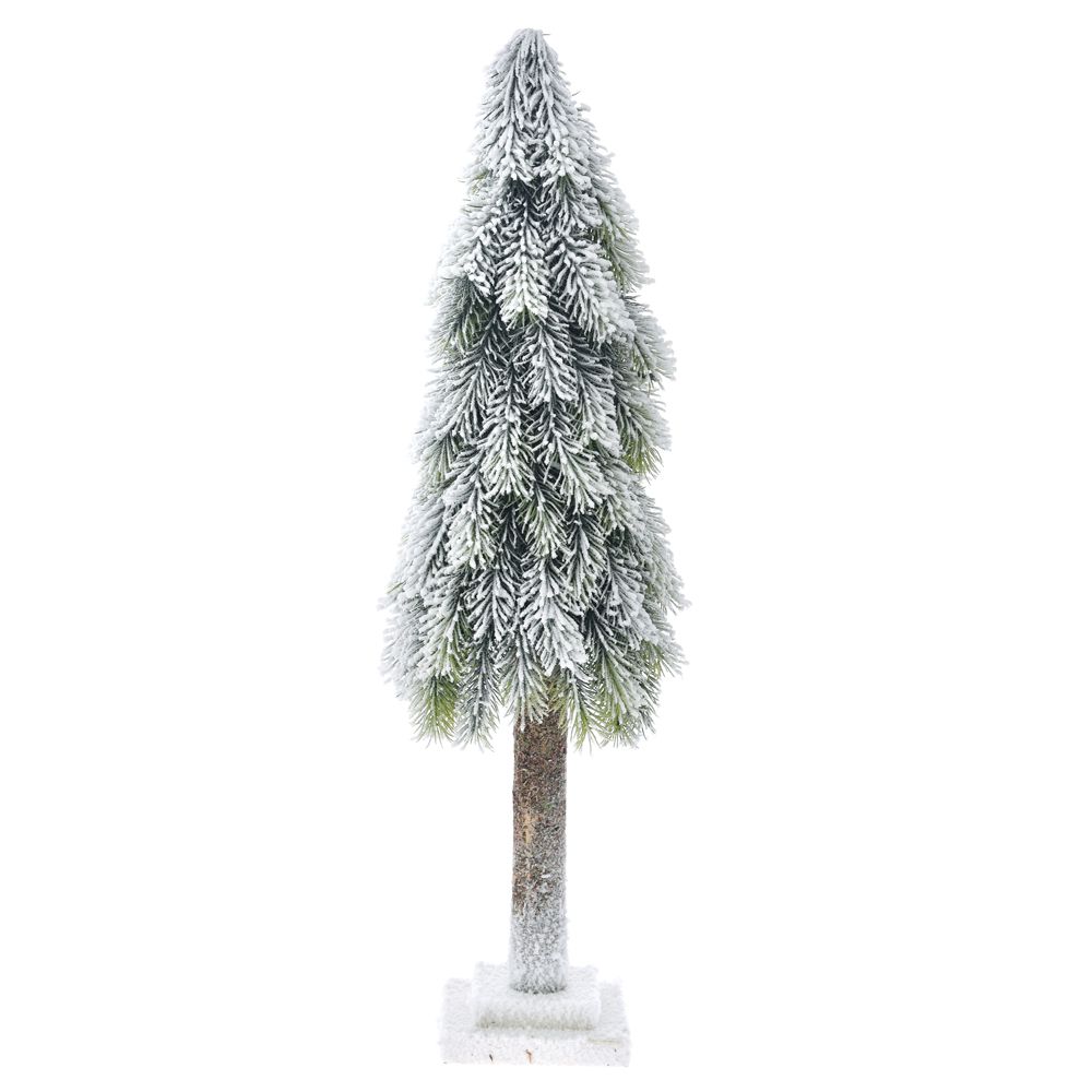 Χριστουγεννιάτικο χιονισμένο δενδράκι, τοποθετημένο πάνω σε ξύλινη βάση.
